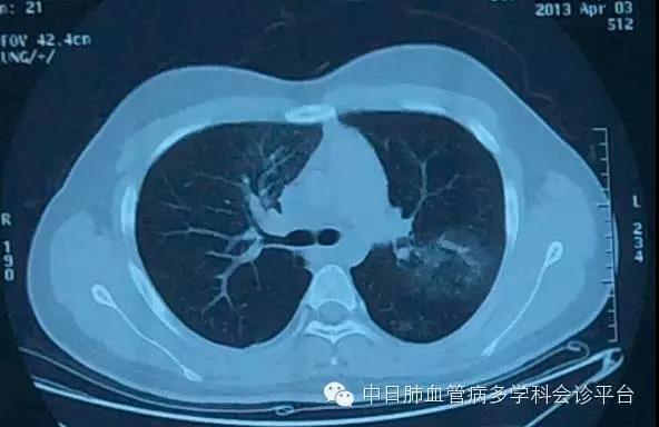 患者于2011年3月无明显诱因出现呼吸困难,活动后明显,无咳嗽、无发热、无胸痛、无咯血,起初未予重视。2011年4月6日出现左下肢水肿,伴有左下肢疼痛,于当地医院诊断为“肺栓塞下肢深静脉血栓”,给予规范抗凝,自诉2011年4月至2013年3月多次监测INR值基本控制在2.0左右。2013年3月患者因发热、呼吸困难再次住院,诊断为易栓症,考虑合并有血管炎,给予加用“甲泼尼龙片”口服约3个月停药。2个月前患者无明显诱因出现呼吸困难加重,伴有咳嗽,咳少量血丝痰,发热,于当地医院查心脏彩超示:重度肺动脉高压;易栓症组合指标阳性;PET-CT提示肺动脉高压及肺栓塞;下肢静脉彩超示:左侧腘静脉血栓形成;血管炎指标及抗磷脂抗体阴性,ANCA阴性,风湿指标未见异常,给予泼尼松龙及华法林抗凝。目前患者仍有呼吸困难,咳嗽,咳痰,偶有痰中带血,无胸痛,间断发热,为求进一步系统诊治就诊我院。